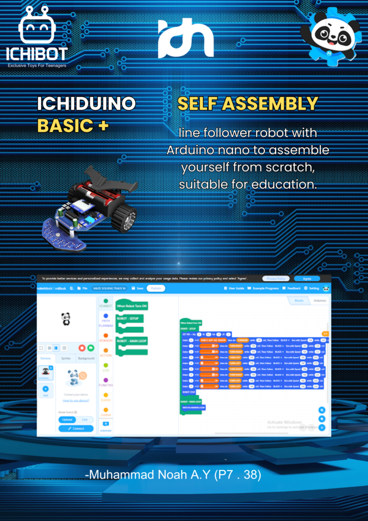 The Ichibot Line Follower is a type of educational robot designed to follow a path or line, typically a black line on a white surface, using sensors to detect the line’s position. It uses infrared or light sensors to differentiate between the line and the background, allowing the robot to adjust its movement and stay on course.